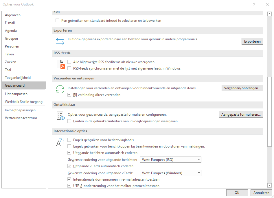 Klik op geavanceerd en scroll aan de rechterkant naar beneden tot je verzenden ontvangen ziet