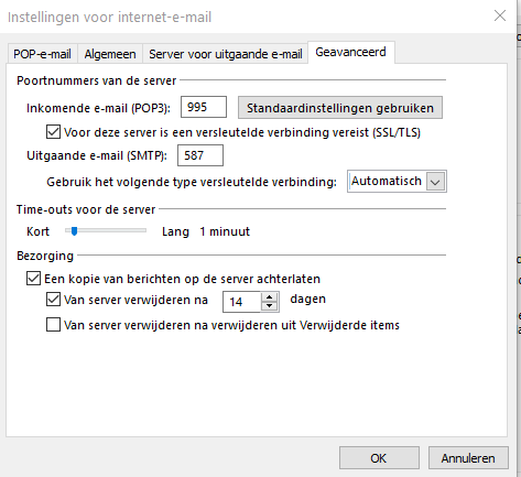 Stel op die pagina de POP poort in op 995 en vink SSL aan.