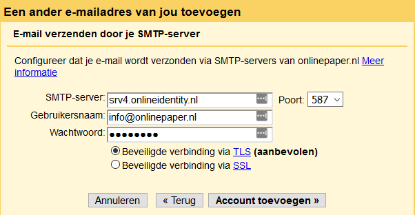 Gebruik de volgende instellingen voor uitgaande e-mail: