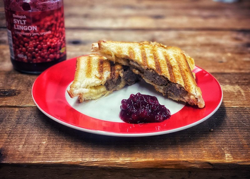 Bak de tosti goudbruin en leg wat Vossenbessensaus op het bord.