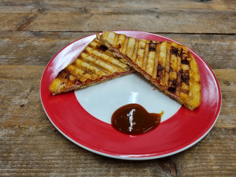Beleg de boterham met kaas, dan salami, dan een paar plakjes chorizo en voeg naar wens jalapeno pepers toe. Hoe meer peper hoe meer heet! Serveren met een beetje curry en zorg voor genoeg drinken om de pepers te blussen.